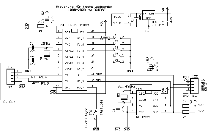 Das kompakte, frequenzstabile und leicht nachzubauende Design gefiel mir so gut, dass ich das Schaltbild des Senders für den FOX fast unverändert übernommen habe. Die von OM Bernd mit nur zwei IC realisierte Steuerung war für unsere Zwecke jedoch nicht geeignet. Sie bot lediglich eine einstellige Buchstabenkennung und war als Dauerläufer zwar für Übungsfuchsjagden nützlich, entsprach jedoch nicht den Anforderungen für Distriktfuchsjagden nach gültigen Regeln.