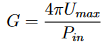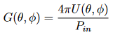 Die Leistungsverstärkung einer Antenne, oder einfach die Verstärkung G, ist ein Maß für die Leistung, die sie in eine bestimmte Richtung im Vergleich zur Leistung abstrahlt, die von einem isotropen Strahler in derselben Richtung abgestrahlt wird, wenn beiden Antennen die gleiche Leistung Pin zugeführt wird. Ein isotroper Strahler ist eine theoretische Quelle, die, wenn sie im Zentrum einer Kugel platziert wird, die Oberfläche der Kugel gleichmäßig beleuchten würde. Die Verstärkung hängt von der Effizienz und der Direktivität der Antenne ab und variiert daher mit azimutalen und elevationswinkeln