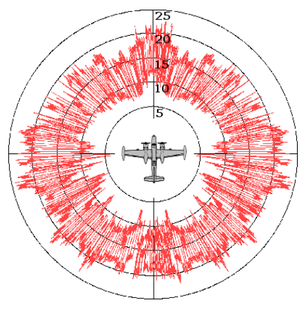 Der Radarquerschnitt eines Objekts beschreibt, wie viel Energie es zu einem Radarempfänger reflektiert. Der Radarquerschnitt ist eine imaginäre Fläche, die angenommen wird, um einfallende Strahlung abzufangen. Die Fläche entspricht dem, was notwendig ist, um die Menge an Energie zu erfassen, die, wenn isotrop ausgestrahlt, zu dem Beitrag des Objekts zur Energiedichte am Empfänger führen würde [9]. Die Einheiten des Radarquerschnitts sind Quadrat-Einheiten der Länge, wie bei jeder Fläche. Radarquerschnittsmessungen werden oft in Dezibel relativ zu einem Quadratmeter angegeben. Der Radarquerschnitt eines Flugzeugs variiert erheblich, abhängig von dem Beobachtungswinkel, wie in der Radarquerschnittsdiagramm in Abb. 2 gezeigt.