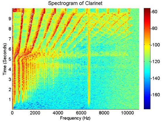 Abb. 3. Beispiel für ein Spektrogramm. Das Spektrogramm einer Klarinette, die die ersten 10 Sekunden von "Rhapsody in Blue" spielt. Mehrere Harmonische, die vom Instrument erzeugt werden, können durch die Betrachtung des Spektrogramms festgestellt werden. Die Tonhöhe beginnt sich etwa bei 5 Sekunden zu erhöhen.