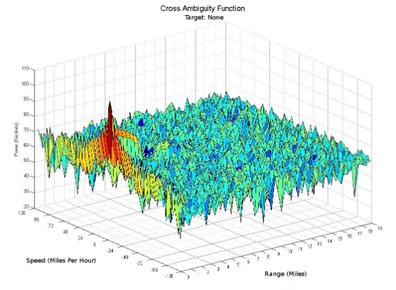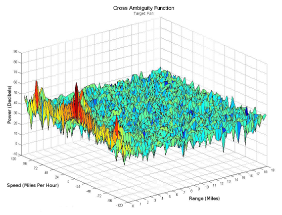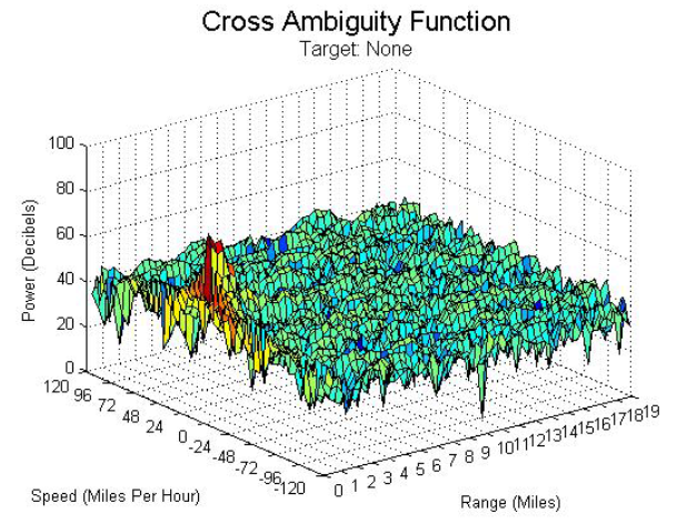 Das Spektrum eines Radar-Signals beeinflusst maßgeblich die Auflösung der Kreuz-Ambiguitätsfunktion. Die Auflösung der Kreuz-Ambiguitätsfunktion von Signalen wie analogen Radiostationen wird durch den Inhalt des Station-Programms beeinflusst. Die ideale Kreuz-Ambiguitätsfunktion wird als Daumennagel-Funktion bezeichnet und hat einen einzelnen Spike am Ursprung. Ein Beispiel für eine Kreuz-Ambiguitätsfunktion, die die ideale Daumennagel-Funktion annähert, ist in Abbildung 4 dargestellt. In dieser Arbeit werden nur zwei Quadranten der Kreuz-Ambiguitätsfunktion gezeigt, da die anderen beiden gemäß der Symmetrieeigenschaft nur redundante Informationen enthalten. Jeder Punkt im Definitionsbereich der Funktion entspricht einer eindeutigen Zielgeschwindigkeit und bistatischen Reichweite. Der Wert der Funktion an jedem Punkt gibt die relative Größe des empfangenen Echos von einem Ziel in einer bestimmten Entfernung und mit einer bestimmten Geschwindigkeit an.