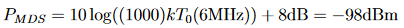 Gleichung (16) wird in Dezibel ausgedrückt, wie in Gleichung (12). Die mit Gleichung (16) berechnete Leistung ist in Einheiten von dBm angegeben, weshalb das thermische Rauschen mit 1.000 multipliziert wird, um Watt in Milliwatt umzuwandeln. Gleichung (16) ist nützlich, da die Rauschzahl eines Empfängers oft vom Hersteller angegeben wird.