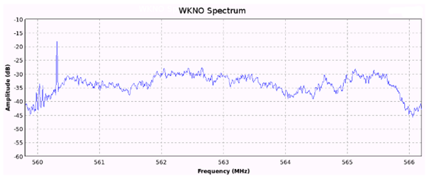 Fig. 10. Spektrum von WKNO. Das Signal von WKNO nimmt das Frequenzspektrum zwischen 560 MHz und 566 MHz ein. Der Träger lässt sich leicht bei 560,31 MHz identifizieren.