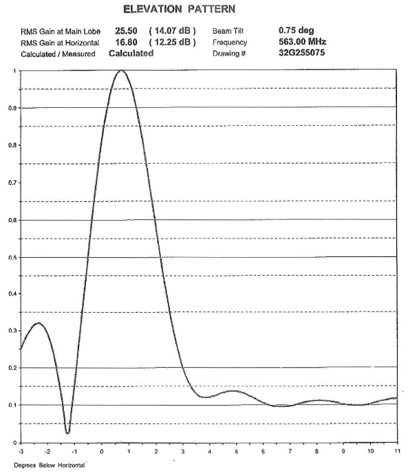 Abb. 12. Vertikales Antennenmuster für die Senderantenne [18]. Der Strahlungsbereich der Senderantenne hat eine vertikale Halbwertsbreite von nur etwa 2 Grad und ist um 0,75 Grad nach unten geneigt. Die Strahlbreite wurde nicht so schmal erwartet.