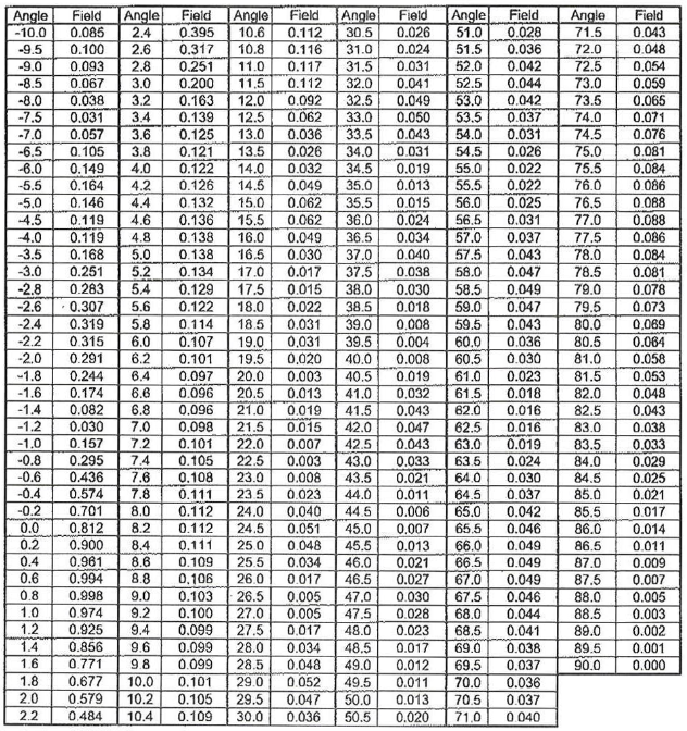 Tabelle 1. Höhenmuster-Tabelle für die Senderantenne [18]. Die Werte in dieser Tabelle wurden in Abbildung 12 verwendet. Der untere Rand des Strahls liegt etwa 1,6 Grad unter der Horizontalen, und der obere Rand liegt etwa 0,2 Grad über der Horizontalen.