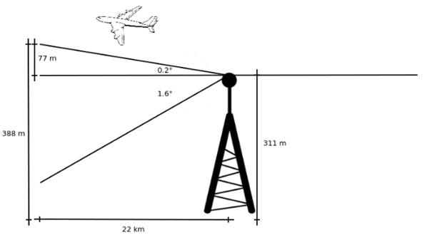 Die schmale, nach unten geneigte Antennenstrahlung führt dazu, dass nur Flugzeuge in extrem niedrigen Höhen gut beleuchtet werden. Abbildung 13 zeigt, wie die schmale vertikale Strahlbreite des Senders die Höhe begrenzte, in der Flugzeuge erkannt werden konnten. Selbst 22 km entfernt vom Sender am General DeWitt Spain Airport liegt die Spitze des Strahls nur 77 m über der Antenne in einer Höhe von 311 m, von der er stammt. Dies führt dazu, dass nur Flugzeuge, die unter 388 m fliegen, gut beleuchtet werden. Die extreme Schmalheit der Strahlbreite war zu Beginn dieser Forschung nicht bekannt und wird weitgehend für die erheblichen und unerwarteten Schwierigkeiten bei der Erkennung von Flugzeugen in moderat hohen Höhen verantwortlich gemacht.
