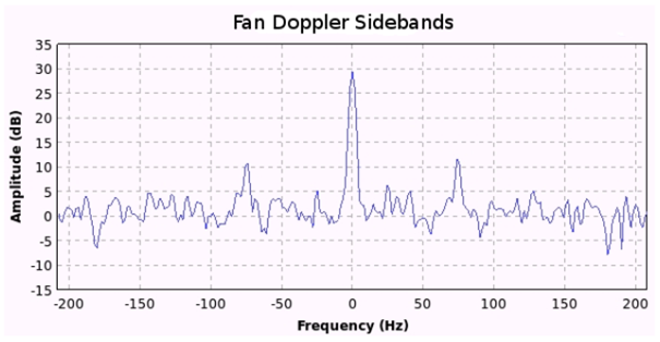 Fig. 14. Doppler-Seitenbänder eines Lüfterziels. Die durch eine rotierende Lüfterklinge verursachten Dopplerverschiebungen werden auf jeder Seite des Trägers dargestellt.
