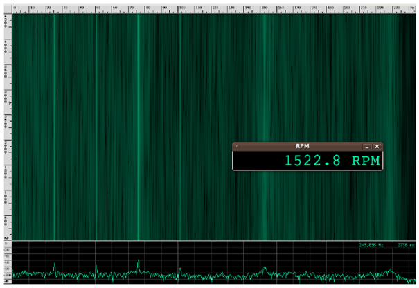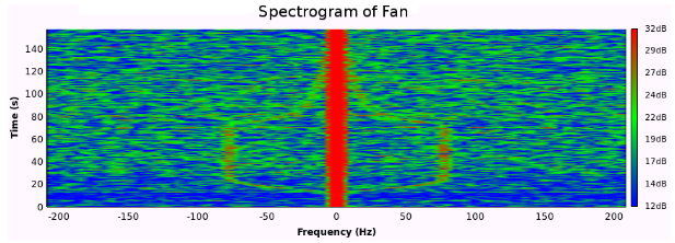 Um festzustellen, ob die mit dem Doppler-Effekt gemessene Geschwindigkeit der Lüfterblätter vernünftig war, wurde die Geschwindigkeit auch durch Analyse des vom Lüfter emittierten Geräuschs gemessen. Das Audiosignal wurde von einem Mikrofon in der Nähe des Lüfters aufgenommen. Ein Spektrogramm des Audiosignals ist in Abbildung 15 dargestellt. Die grundlegende harmonische Frequenz wurde bei 76 Hz gefunden, was einer Winkelgeschwindigkeit von 1523 U/min entspricht. Unter Verwendung des Durchmessers des Lüfters von 19,5 Zoll wird die Geschwindigkeit der Flügelspitzen auf etwa 88 Meilen pro Stunde geschätzt, was in enger Übereinstimmung mit der Doppler-Messung von 90 Meilen pro Stunde liegt.