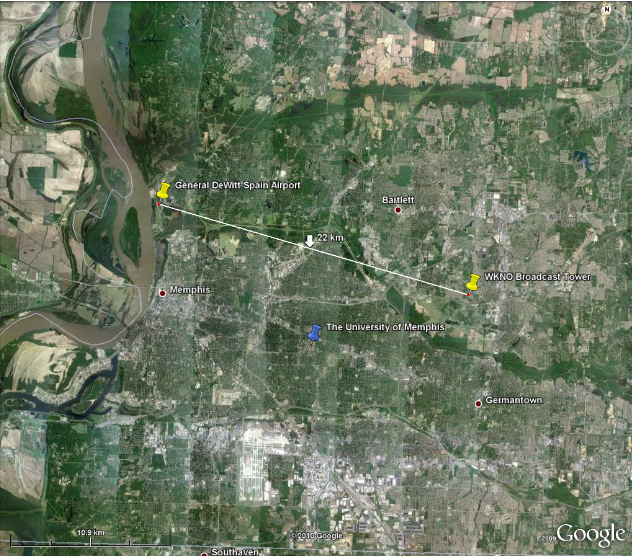 Trotz der Verbesserungen durch die Yagi-Antenne war das System immer noch nicht in der Lage, tieffliegende Flugzeuge über dem Campus der University of Memphis zu erkennen. Nachdem keine zufriedenstellenden Ergebnisse bei der Datensammlung auf dem Universitätsgelände erzielt werden konnten, wurde das System am General DeWitt Spain Airport aufgestellt, um Daten von startenden und landenden Flugzeugen zu sammeln. Der General DeWitt Spain Airport befindet sich 22 km entfernt vom WKNO-Sendestandort, wie in Abb. 17 gezeigt.