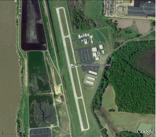 Abb. 18. Luftaufnahme des Sammelorts am Flughafen [19]. Das System wurde eingerichtet und die Daten wurden 120 m seitlich vom Mittelpunkt der Landebahn gesammelt. Ein ähnliches System [1] verwendete einen zweiten Empfänger und eine gerichtete Antenne zur zusätzlichen Isolierung des Direktpfad-Signals. Die zweite Antenne war auf den Sender ausgerichtet, um nur das Direktpfad-Signal zu empfangen. Der Kanal, der das Direktpfad-Signal empfängt, oder der Referenzkanal, wurde vom Zielkanal abgezogen, um mehr vom Direktpfad-Signal aus dem Zielkanal zu entfernen. Das Ergebnis dieser Kanal-Subtraktion wurde zusammen mit dem Signal des Referenzkanals verwendet, um die Kreuzambiguitätsfunktion zu berechnen.