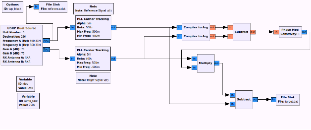 Abb. 19. Blockdiagramm des Datenerfassungsprozesses. Referenz- und Zielkanalsignale stammen aus dem USRP-Quellblock. PLL-Blöcke verwenden die Trägerfrequenz als Referenz, um beide Kanäle auf die gleiche Frequenz feinzutunen. Der Phasenunterschied zwischen den Signalen wird berechnet und zur Anpassung der Phase des Zielsignals verwendet, sodass es phasenkohärent mit dem Referenzsignal ist.