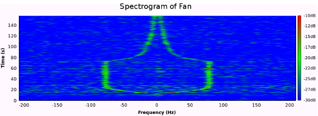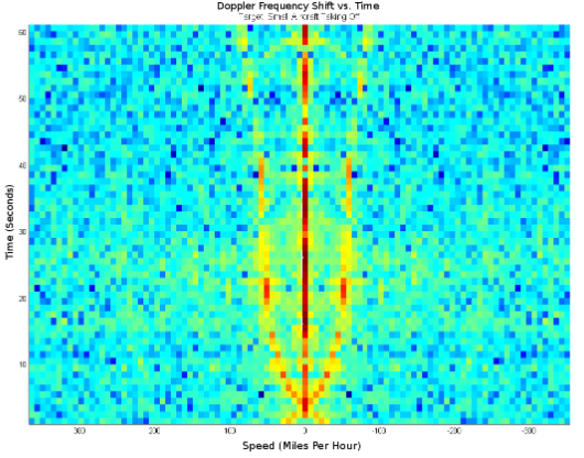 Das Spektrogramm in Abbildung 16 zeigt, wie sich das Doppler-Spektrum verändert, wenn sich die Geschwindigkeit eines Ziels ändert. Das Ziel ist ein sich startender und stoppender Ventilator, und es wird nur ein einzelner Radioreceiver und eine Antenne verwendet. Die vertikale Linie bei null Hertz ist der Träger des digitalen Fernsehsignals. Die durch die sich bewegenden Ventilatorblätter verursachte Dopplerverschiebung ist auf beiden Seiten des Trägers zu erkennen. Die Ventilatorblätter beginnen sich zwischen 10 und 30 Sekunden zu drehen und zu beschleunigen. Zwischen 30 und 50 Sekunden dreht sich der Ventilator mit konstanter Geschwindigkeit und verursacht eine Dopplerverschiebung von etwa 75 Hz. Etwa bei 50 Sekunden wird der Ventilator ausgeschaltet, und die Ventilatorblätter beginnen langsam abzubremsen. Ohne Abzug eines Referenzsignals vom Zielsignal ist die direkte Pfadinterferenz sehr deutlich.