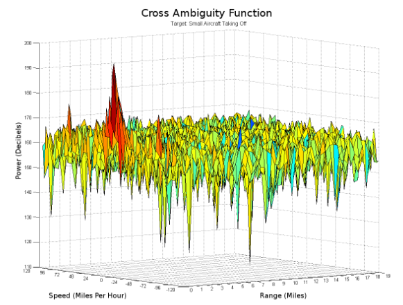 Die Kreuz-Ambiguitätsfunktion gibt die Antwort eines Filters wieder, das auf eine bestimmte Dopplerverschiebung und Zeitverzögerung im Verhältnis zu einem Referenzsignal abgestimmt ist [13]. Durch Abstimmen des Filters auf eine bestimmte Dopplerfrequenz und Zeitverzögerung kann das Vorhandensein eines Ziels mit einer bestimmten Geschwindigkeit und an einer spezifischen bistatischen Entfernung festgestellt werden.